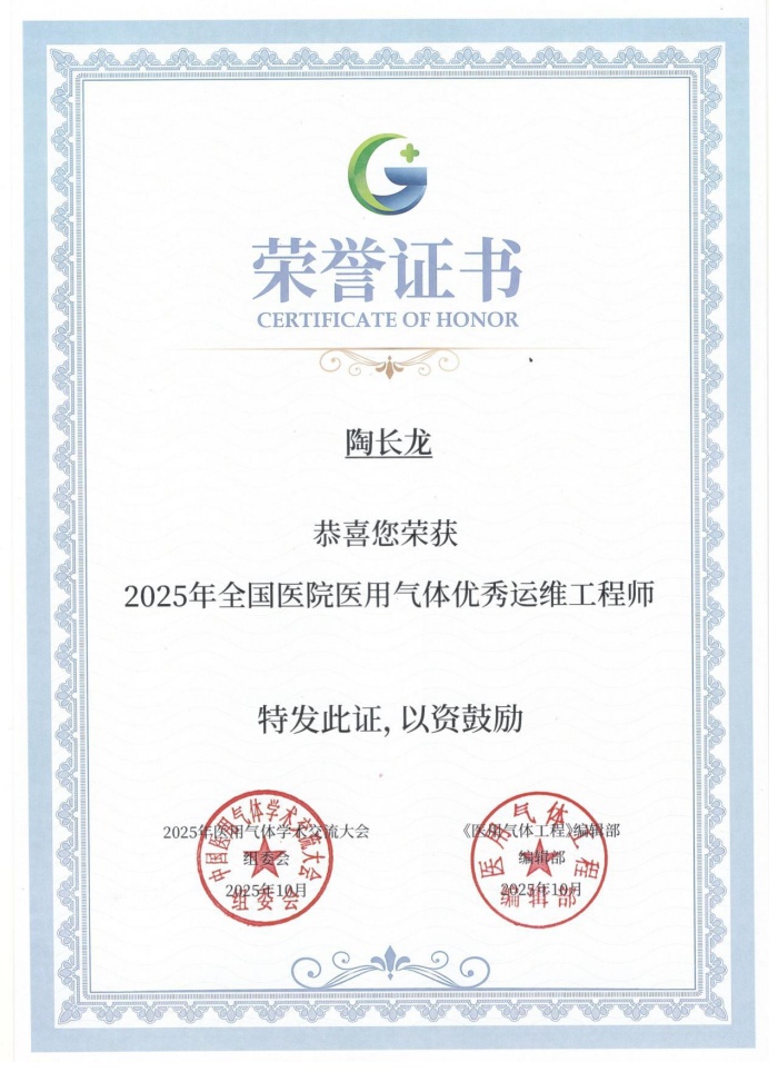 我院设备科积极组织参加了“长安杯2025年全国医用气体管理先进医院”评选,在此次交流大会上,顺利通过行业专家评审,荣获“长安杯2025年全国医用气体管理先进医院”荣誉称号,同时我院设备科陶长龙个人荣获“长安杯2025年全国医院医用气体优秀运维工程师”荣誉称号,其论文《基于星闪技术的医用气体工程监测系统设计与研究》荣获优秀论文奖。(供稿:设备科)